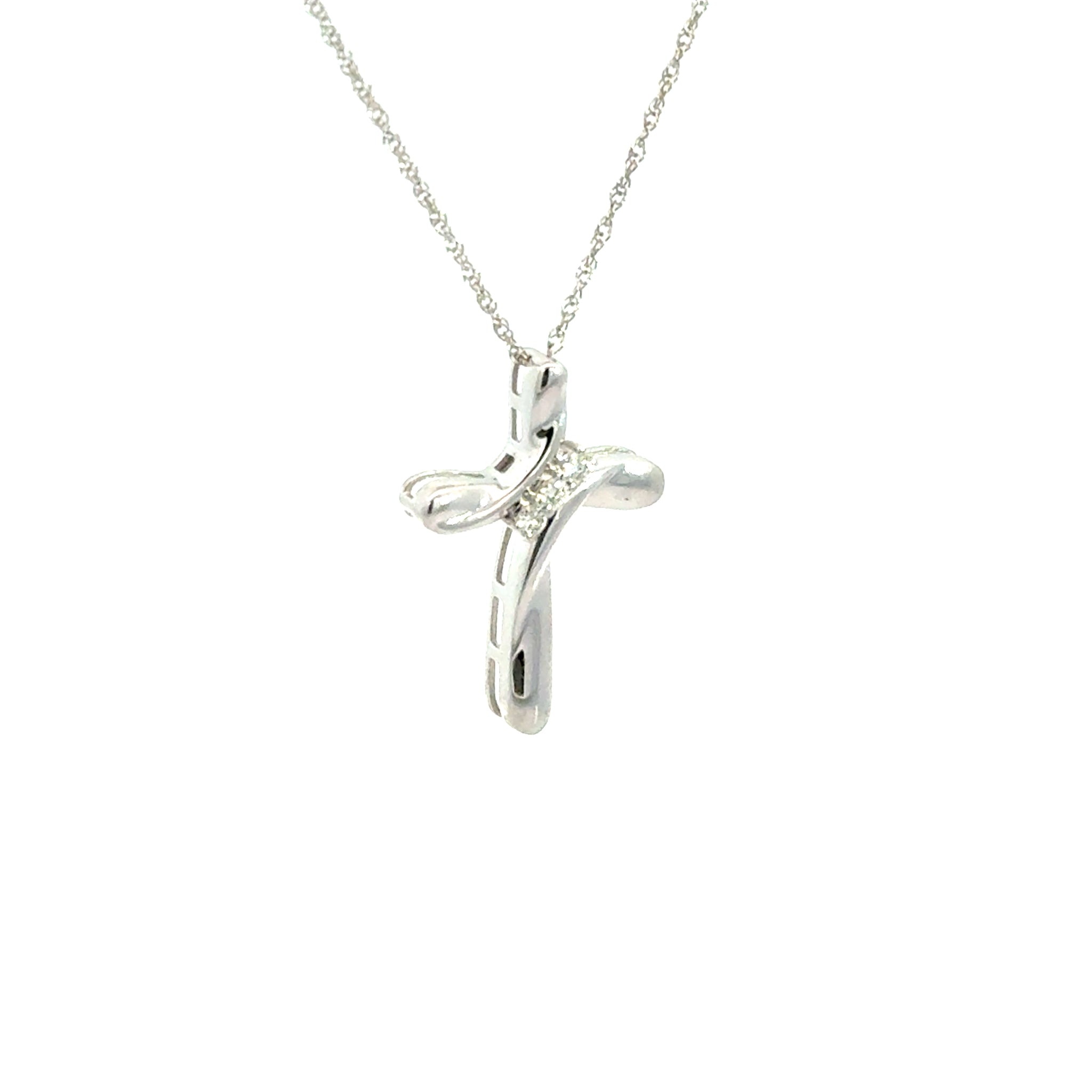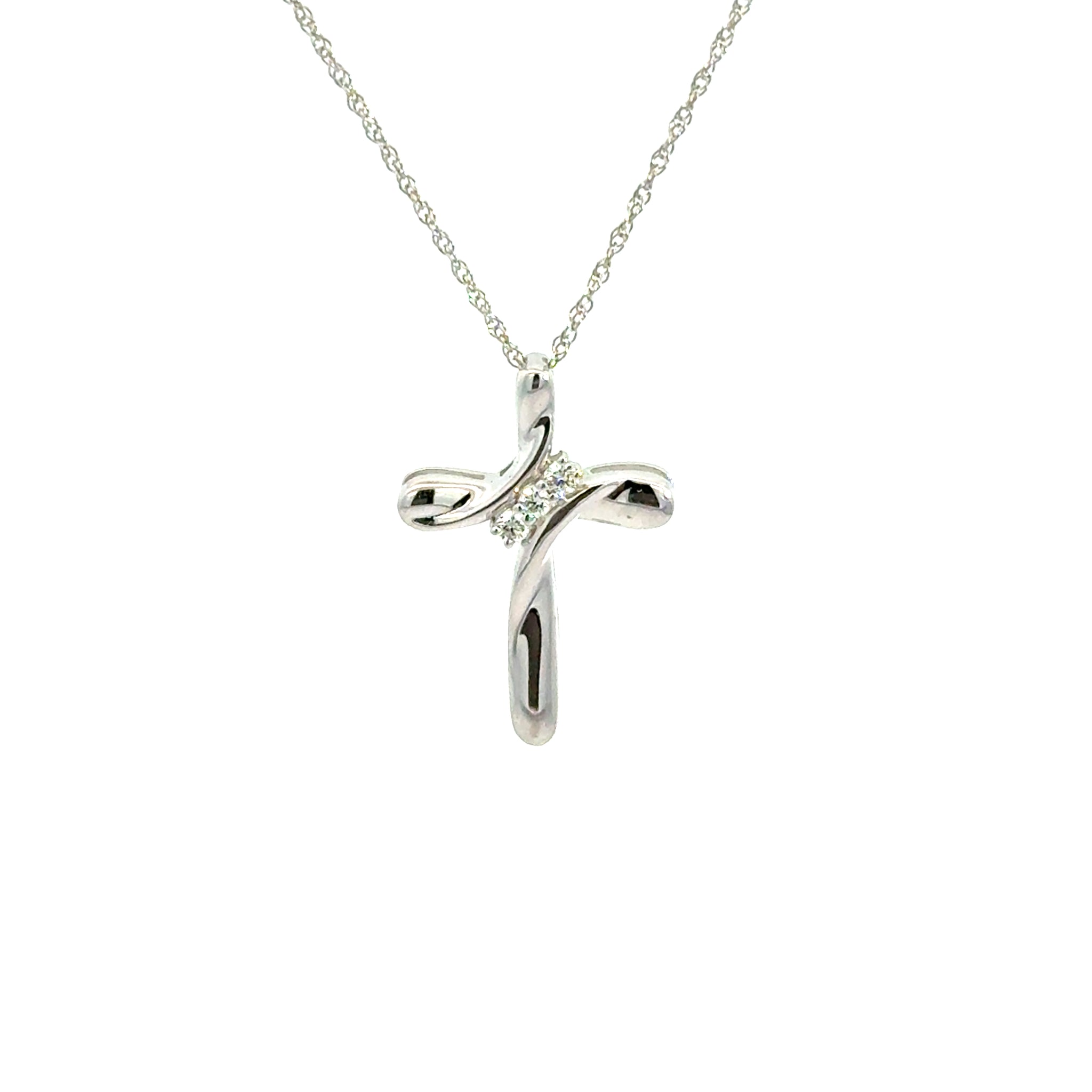 A beautiful statement of faith, this exquisite cross necklace features .05w of sparkling diamonds set in 14kt white gold. Cross is suspended by an 18" white gold chain.