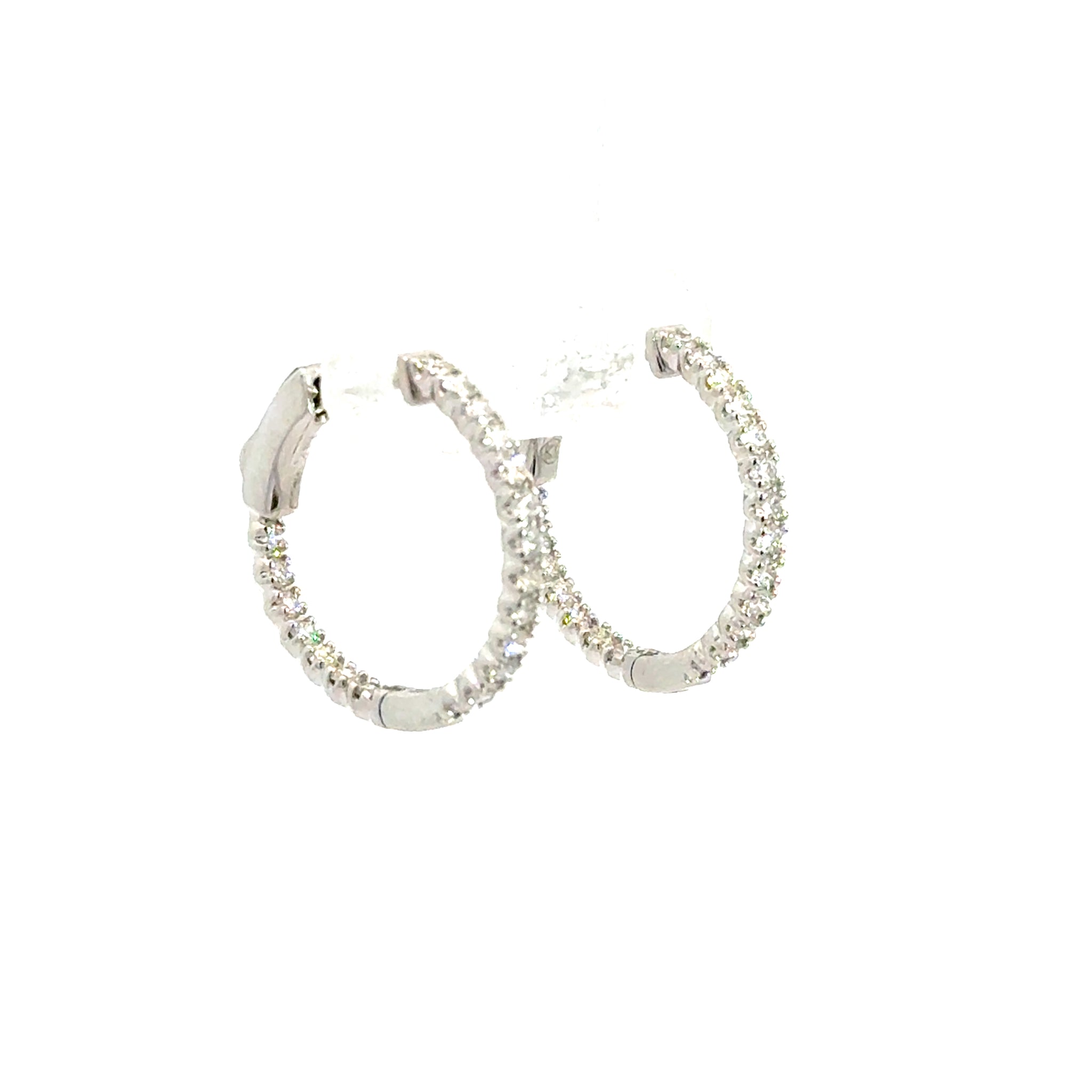 These beautiful diamond hoop earrings contains .76dtw of sparkling brilliant round brilliant diamonds and are set in 14kt white gold.